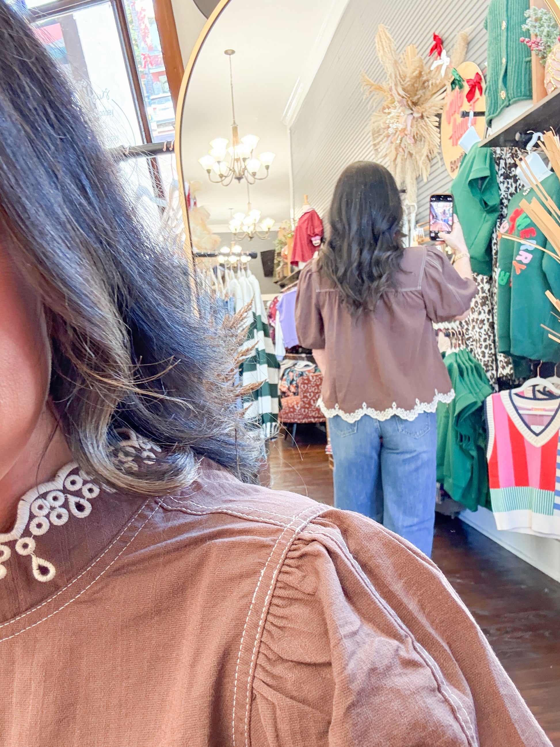 Adorable details make all the difference! This solid puff sleeve top is elevated with delicate scallop embroidered trim that frames the neckline, chest, and hem for a sweet, feminine touch. The back button closure adds both style and practicality, making it easy to slip on and off. Perfect for those days when you want to feel put-together without trying too hard—it's the kind of top that gets compliments!