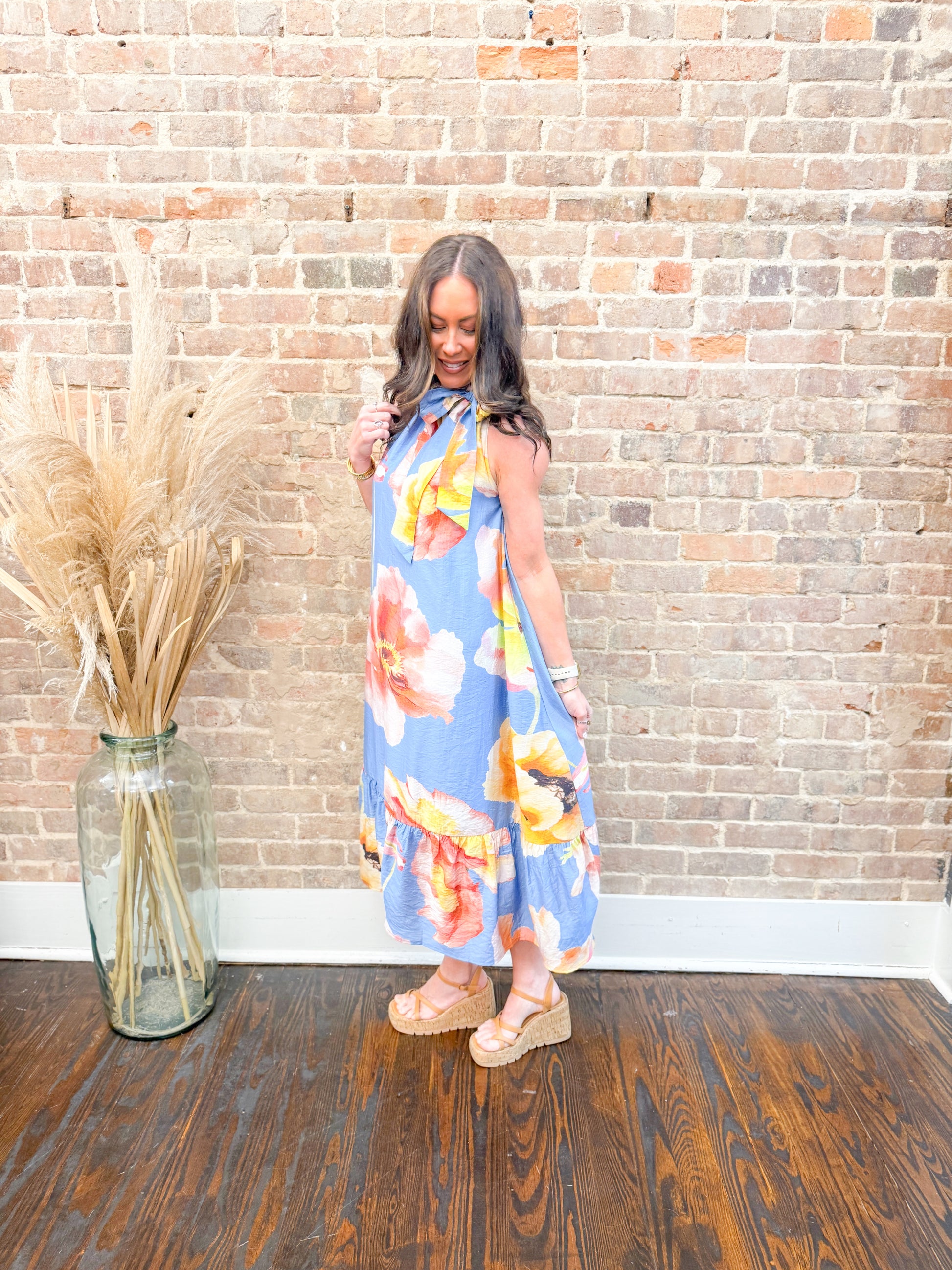 The Blaney Floral Dress combines romantic details with timeless appeal. Showcasing a bold large floral print, this midi dress features a charming ruffle neckline and delicate tie sleeves that add movement and elegance. The flowing silhouette skims the body gracefully, making it versatile for both casual days and special occasions. Perfect for creating effortless, polished looks that celebrate your personal style.