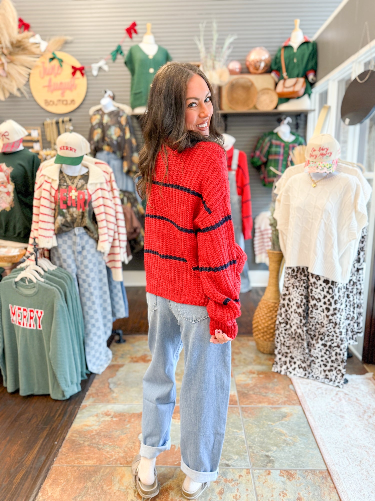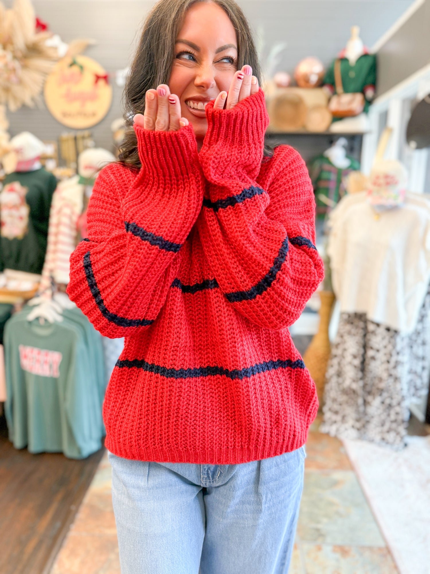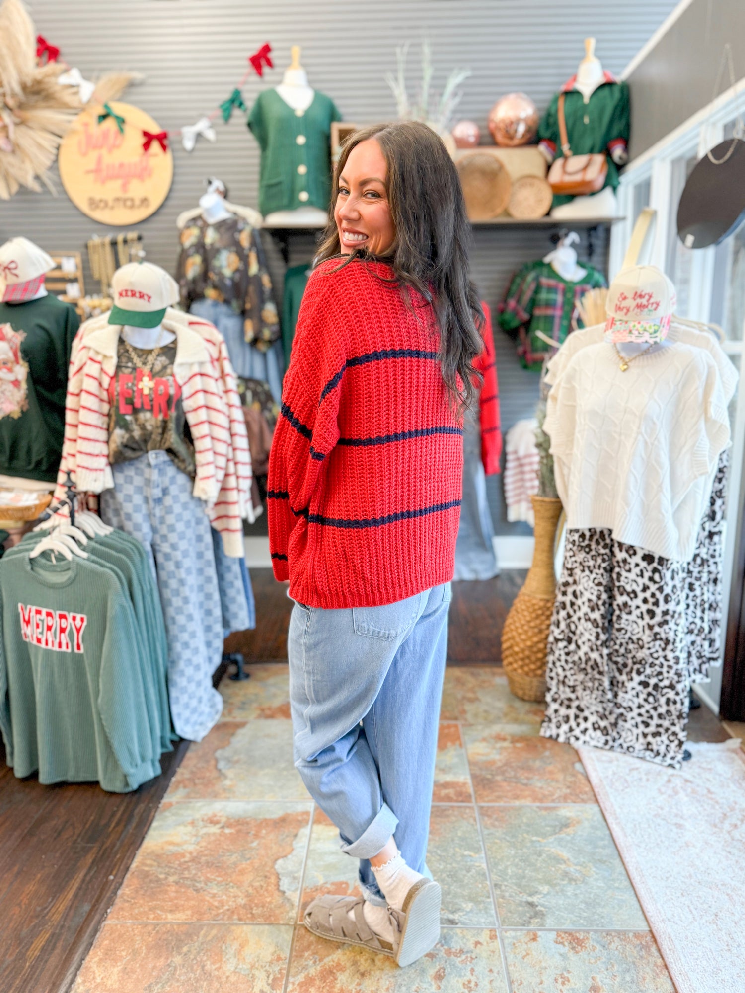 Stay cozy and stylish with the Brylee Oversized Striped Sweater, featuring bold red and navy stripes that add a vibrant touch to your wardrobe. Its relaxed fit offers unmatched comfort, perfect for layering on chilly days or making a statement indoors. Elevate your casual look with this easy-to-wear, effortlessly chic sweater designed to keep you warm without sacrificing style.