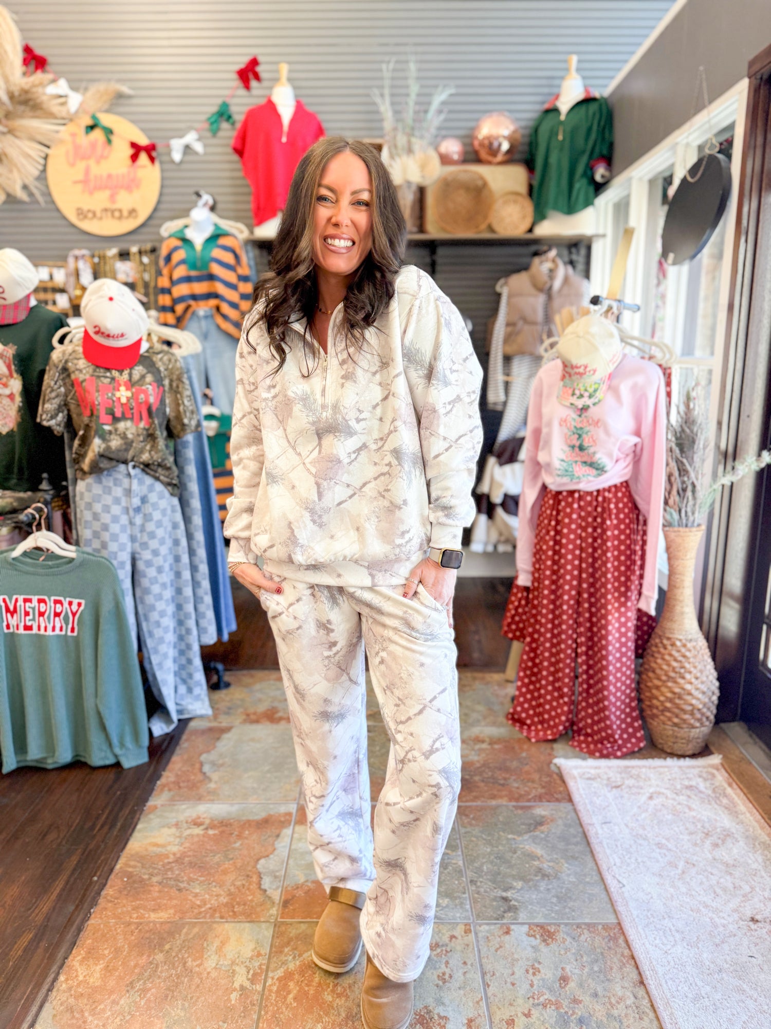 Stay cozy and stylish in this fun camo set! The fleece-lined half zip features a mock neck collar for extra warmth and comfort, while the straight leg pants complete the look with a relaxed, versatile fit. Perfect for casual days when you want to look put-together without sacrificing comfort. Mix and match with your favorite basics or dress it up for an effortless vibe.