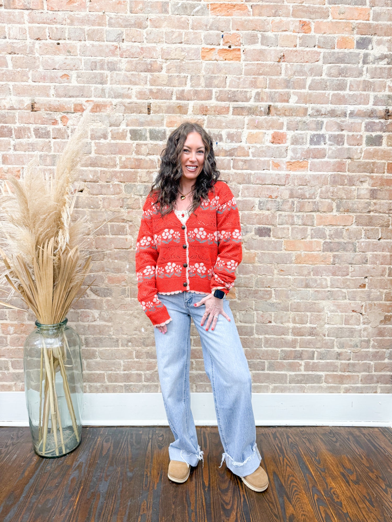 The Ellie Floral Cardigan is your new go-to layer for effortless style! This charming knitted button-down features a playful scallop edge that adds a touch of whimsy to any outfit. With relaxed drop shoulders for that perfectly laid-back vibe, it's designed for comfort without sacrificing looks. Throw it over your favorite tee or dress it up—this versatile piece works for everything from casual coffee runs to weekend hangouts. Pure fun, pure fashion!