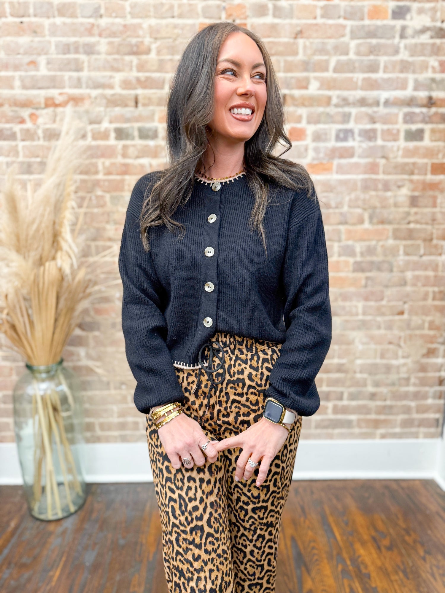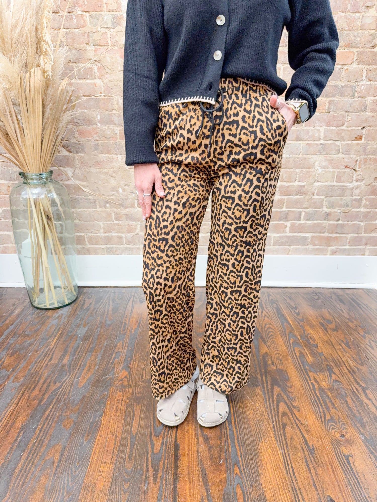 Experience ultimate comfort and style with the Emory Leopard Pants. Crafted from a stretchy ribbed fabric, these wide-leg pants move with you while providing a flattering fit. The adjustable drawstring waist ensures a personalized, secure feel. Perfect for lounging or stepping out, they blend trendy leopard print with versatile comfort to elevate your wardrobe effortlessly.