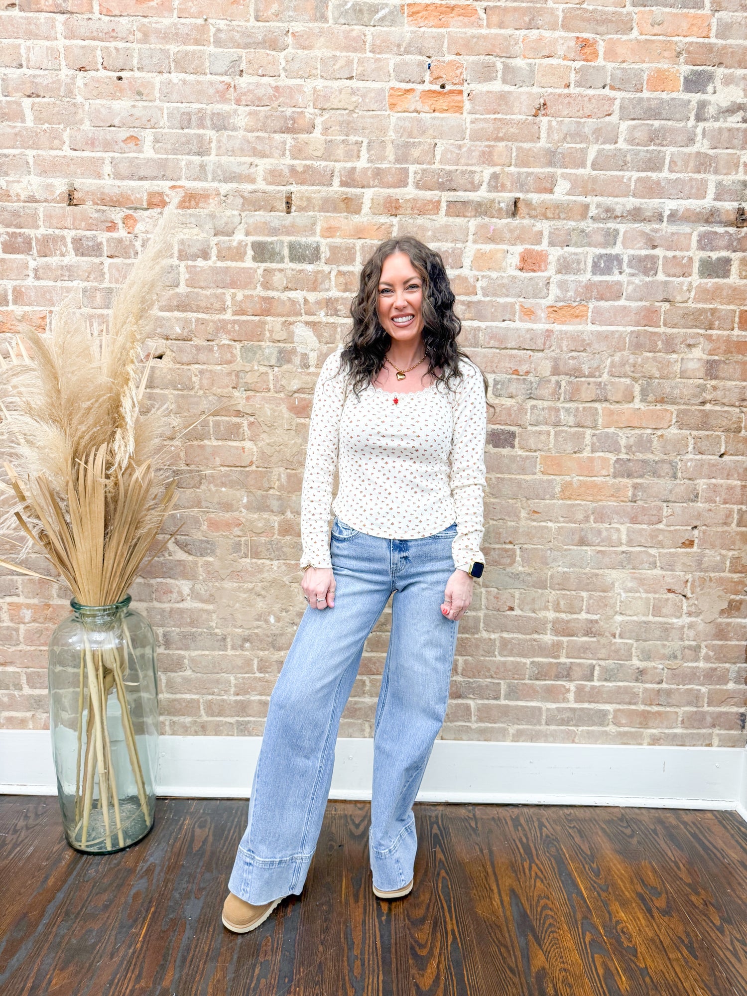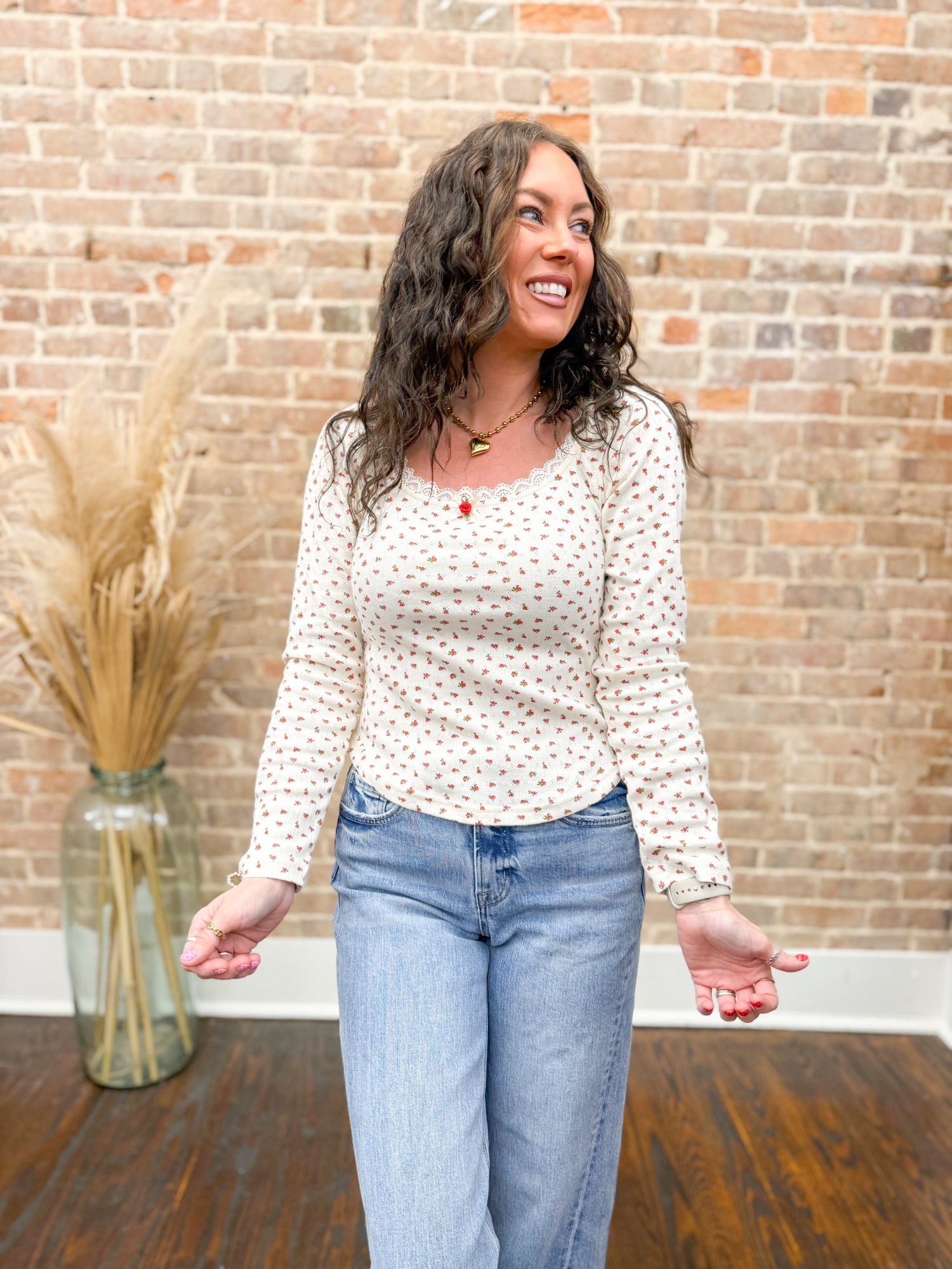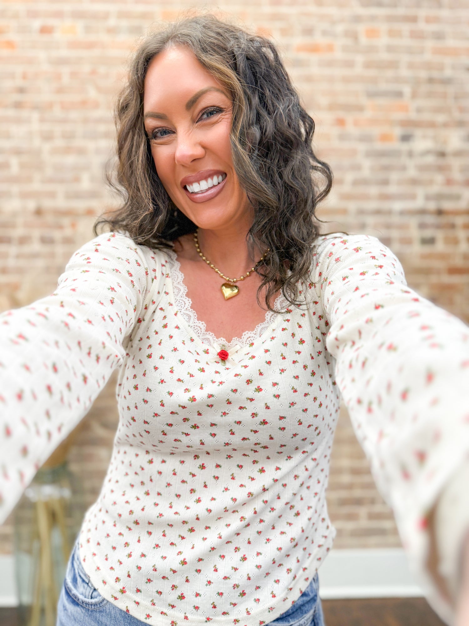 The Everlee Printed Top is your new go-to layering essential! This fitted beauty features delicate lace trim along the edges and an adorable tiny bow detail at the front—because the little touches make all the difference. Perfect for wearing solo or layering under your favorite pieces, it's designed to flatter and bring a playful vibe to any outfit. Whether you're dressing up or keeping it casual, this top adds just the right amount of charm and personality to your wardrobe.