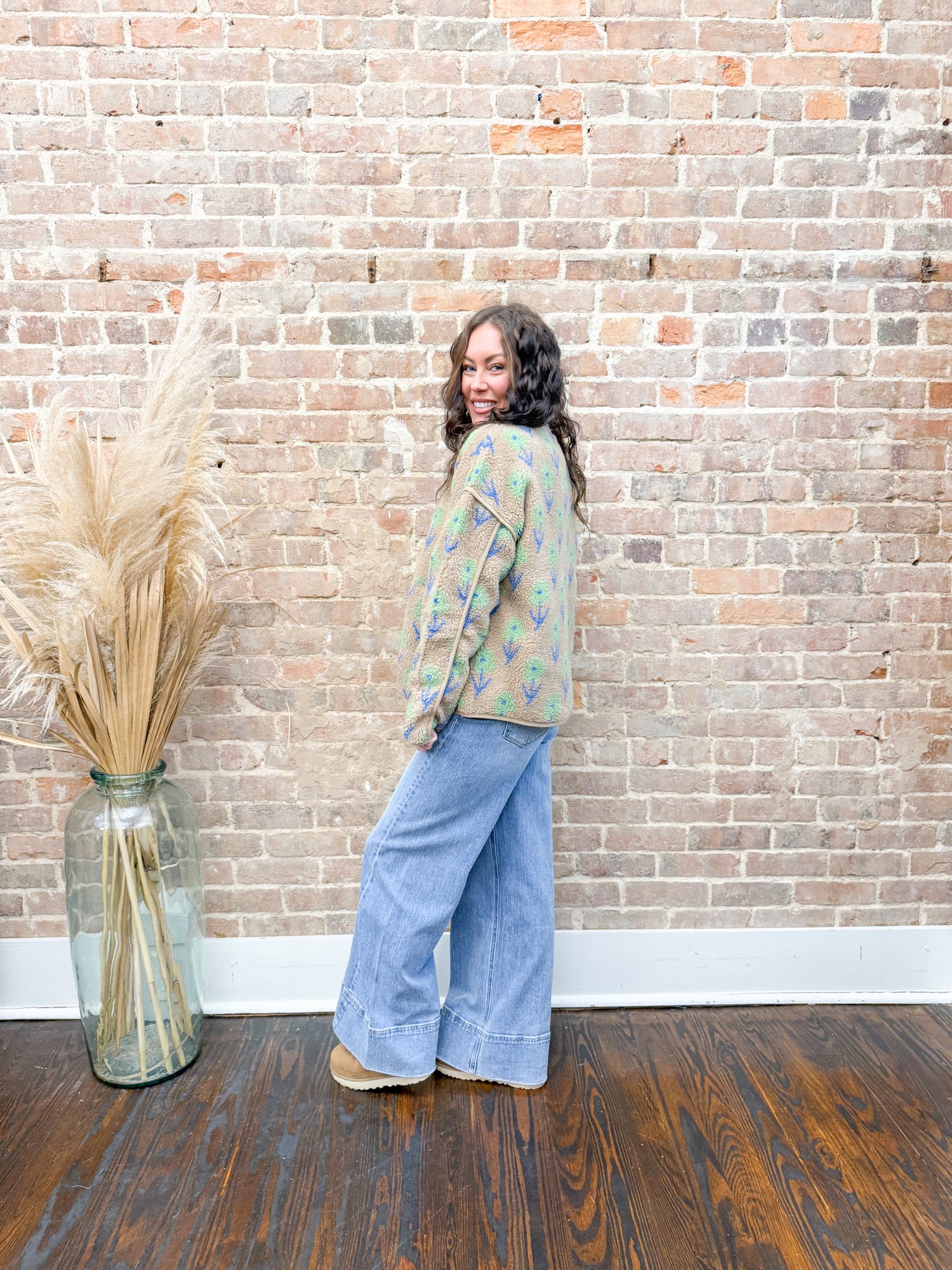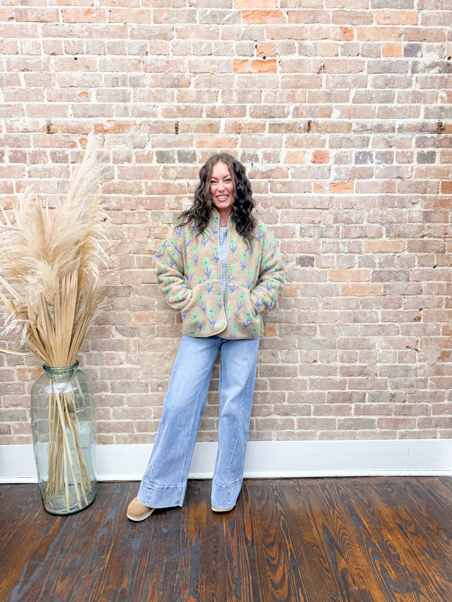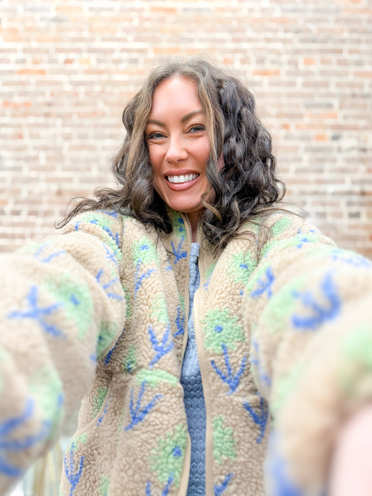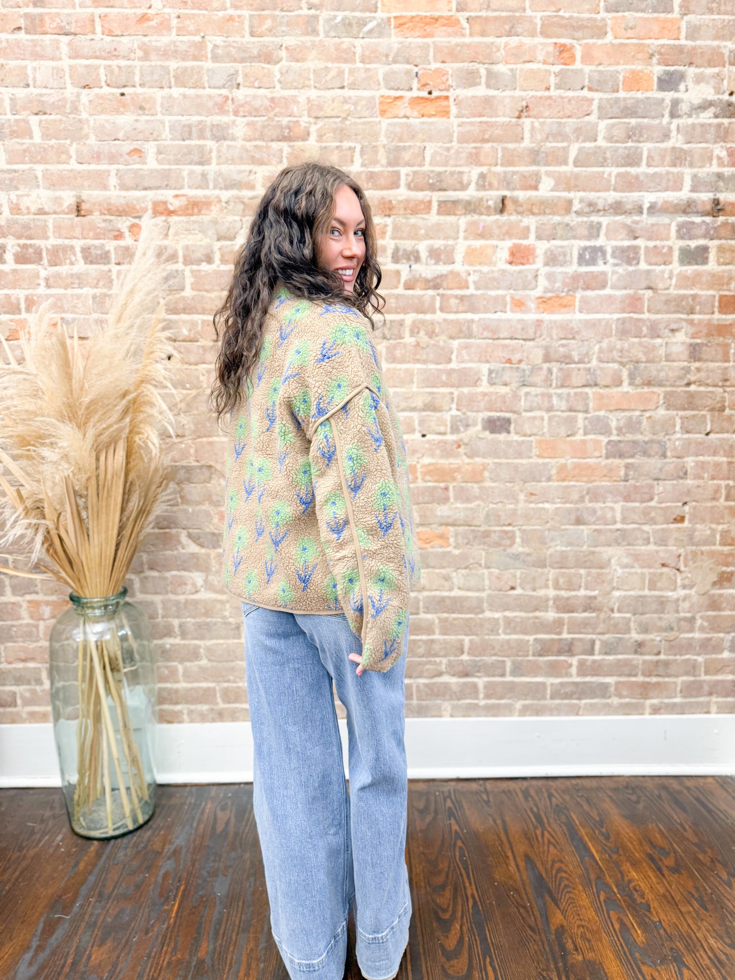 Wrap yourself in cozy charm with the Everlynn Sherpa Jacket—a playful oversized layer featuring a gorgeous printed floral design that brings nature's beauty to your everyday style. The plush sherpa lining keeps you warm and snug, while the relaxed fit makes it perfect for lounging or running errands. Whether you're pairing it with jeans or dresses, this statement piece adds instant personality and comfort to any outfit. A fun, feel-good essential for floral lovers everywhere.
