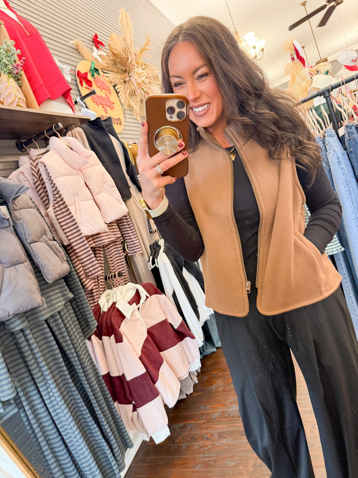 Layer up with the Jamie Fleece Vest—your new go-to for effortless style and serious comfort. This slightly oversized beauty features a cozy fleece lining that feels like a warm hug, plus practical slanted front pockets perfect for keeping your hands toasty or stashing essentials. The full zipper makes it easy to adjust your warmth on the fly. Whether you're running errands or relaxing at home, this vest delivers the perfect blend of comfort and casual cool.