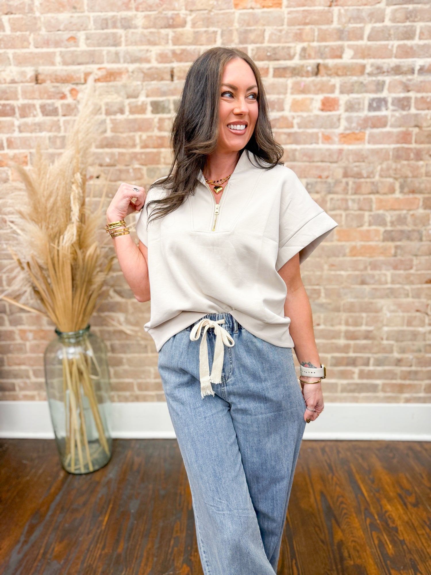Jennifer Scuba Half Zip Top-Beige