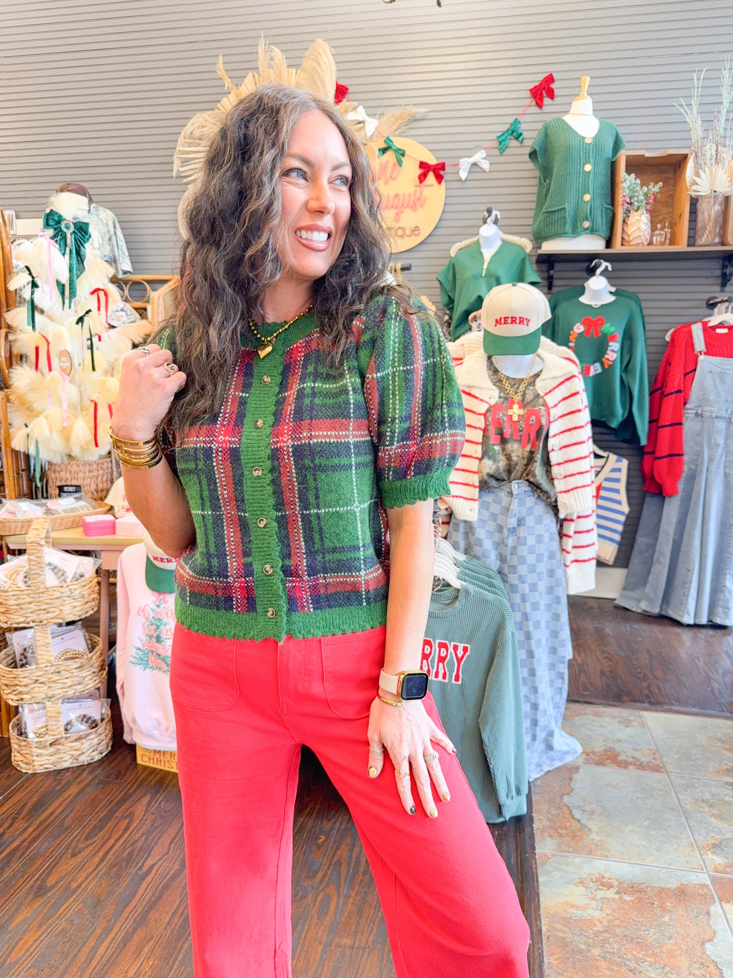 Embrace festive charm with this delightful plaid sweater featuring playful puff sleeves and charming scallop details. The button-down front makes layering effortless, while the whimsical design brings personality to your seasonal wardrobe. Perfect for spreading holiday cheer with every wear!
