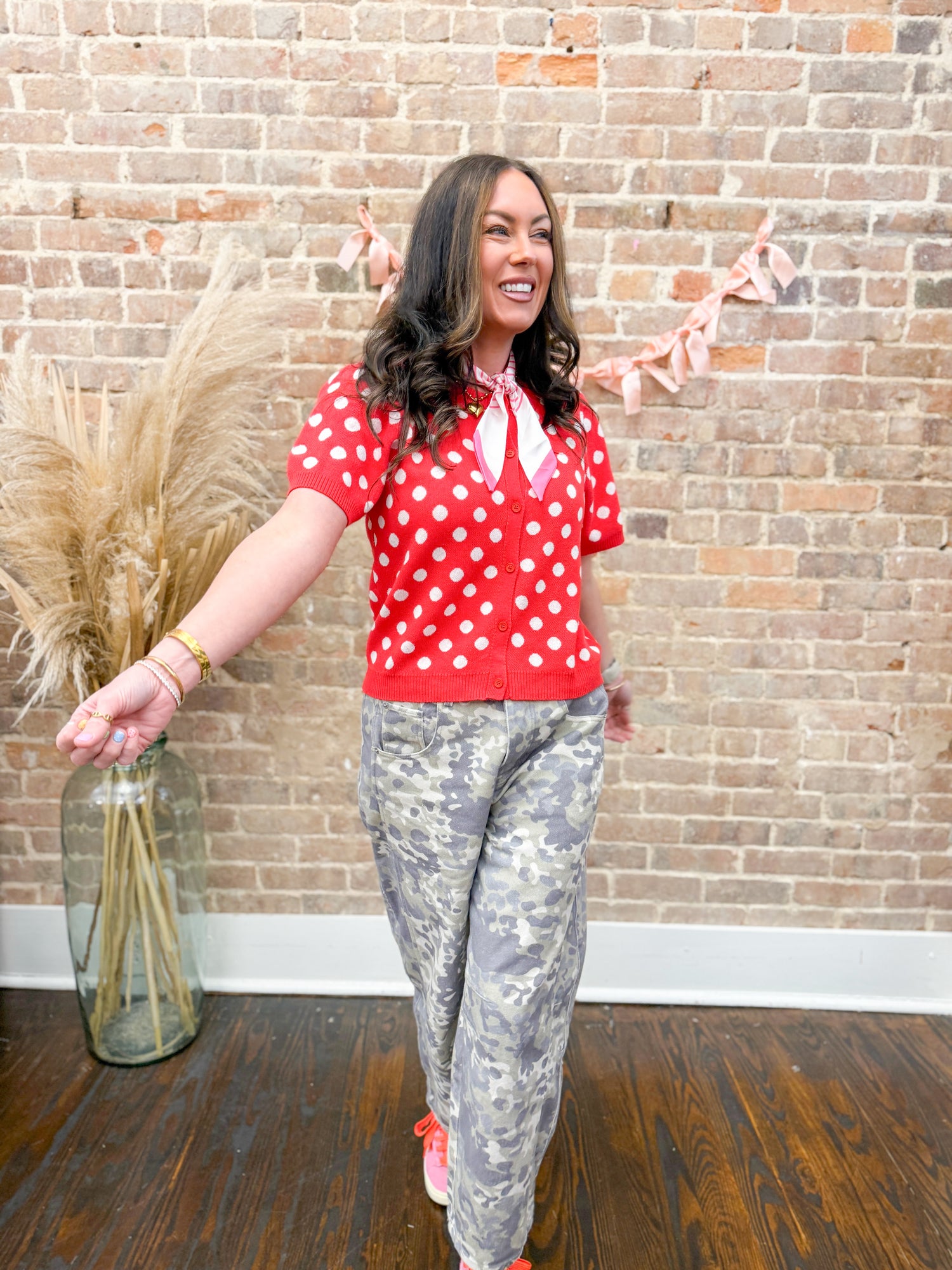 Adorable polka dot sweater with a playful twist! This short sleeve button-down brings effortless charm to your everyday wardrobe. Perfect for layering or wearing solo, it's the kind of piece that makes getting dressed feel like fun. Dress it up with tailored pants or keep it casual with your favorite jeans—either way, you'll love the cheerful vibe it brings to any outfit.