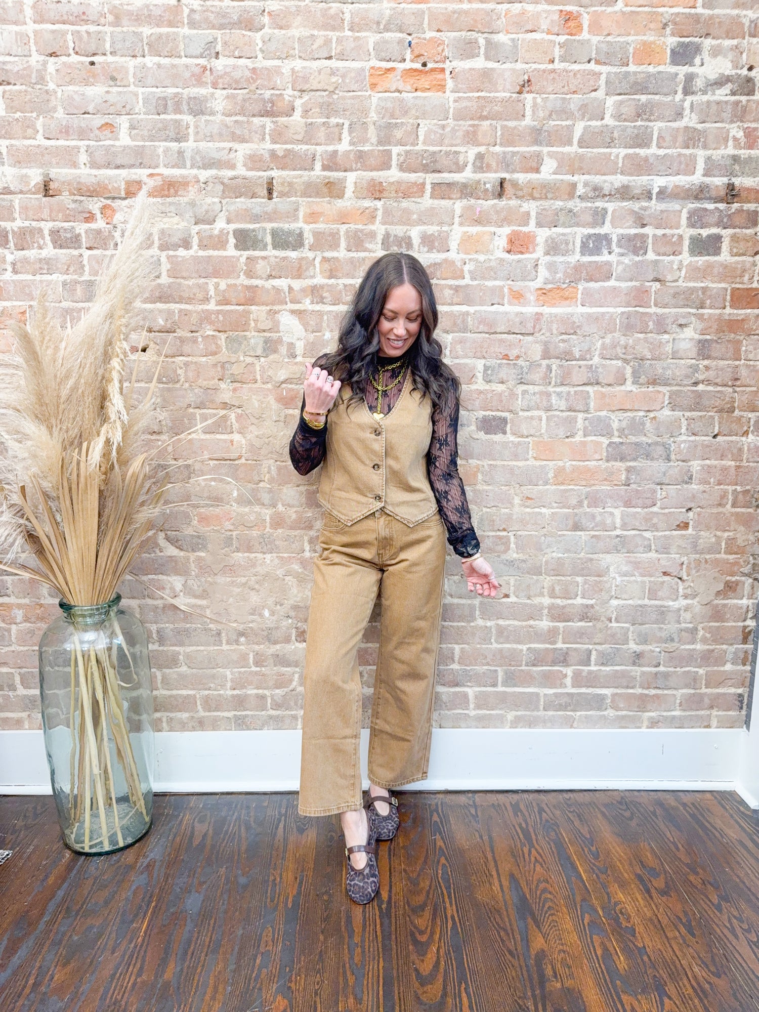 The Kaedyn Denim Vest in camel brown features a timeless washed denim finish and a classic button-down design. Crafted to fit true to size, this versatile vest adds effortless style and a rugged edge to any outfit, perfect for layering through every season. Elevate your wardrobe with this must-have piece that blends comfort and fashion seamlessly.