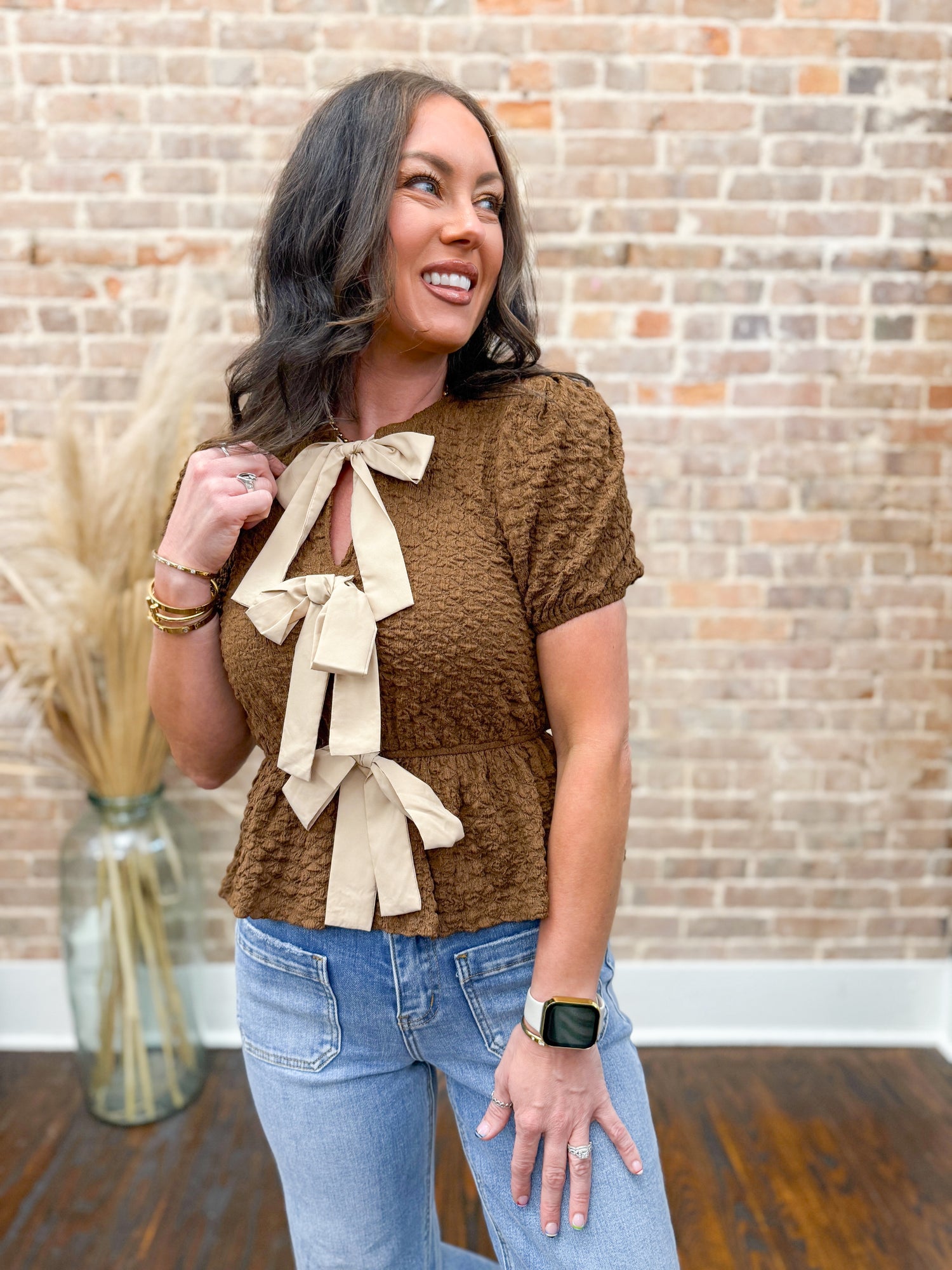 Elevate your wardrobe with the Lynette Bow Detail Top, featuring elegant puff sleeves and a textured knit fabric that adds depth and comfort. The charming front bow detail offers a feminine touch, making this top perfect for both casual outings and dressier occasions. Designed to combine style with a flattering fit, it’s an effortless way to refresh your look.