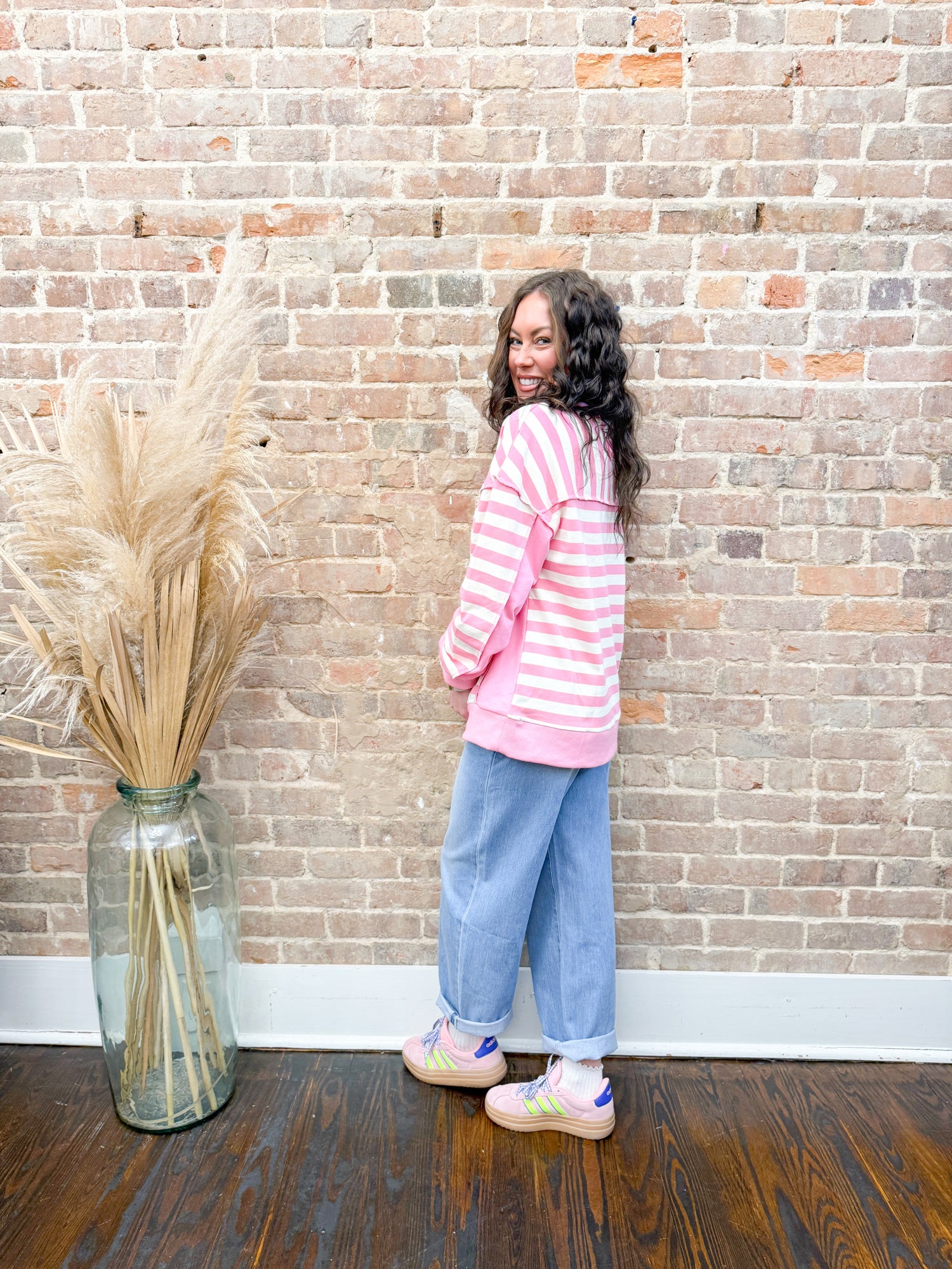 The Macley Striped Top is your new go-to for effortless style! This oversized half button-down features classic stripes that work with everything in your closet. Throw it on over a tee, tie it at the waist, or wear it solo—the relaxed fit and playful vibe make it perfect for casual days when you want to look put-together without trying too hard. Comfort meets cool in this versatile wardrobe essential.
