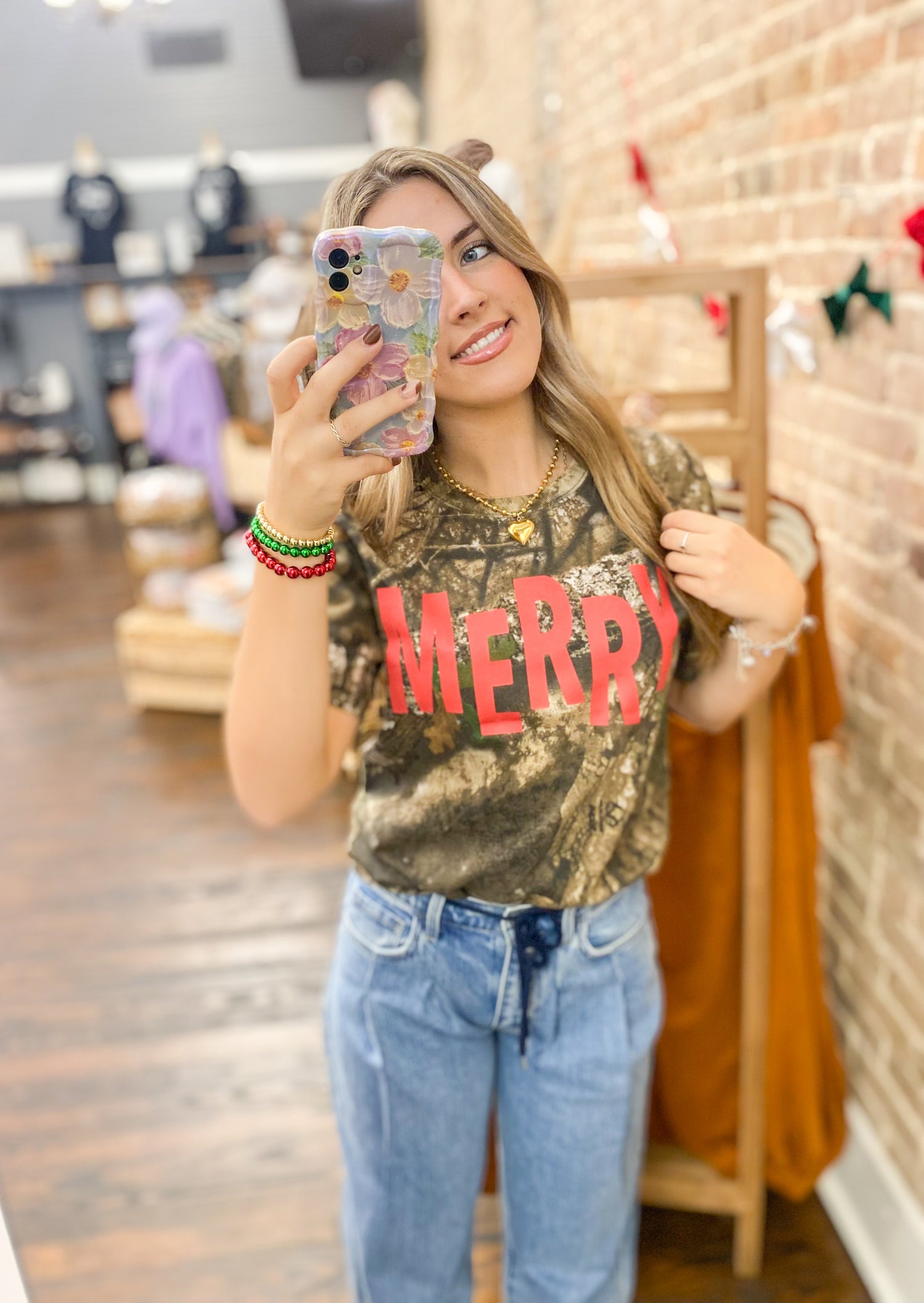 Celebrate the season in style with our Merry Camo T-Shirt, where festive spirit meets tactical edge. This bold tee features authentic camouflage patterning paired with "Merry" emblazoned in vibrant bright red—the perfect statement piece for anyone who refuses to blend in during the holidays. Comfortable, eye-catching, and undeniably unique, it's your ticket to standing out at every gathering. Make this season unforgettable.
