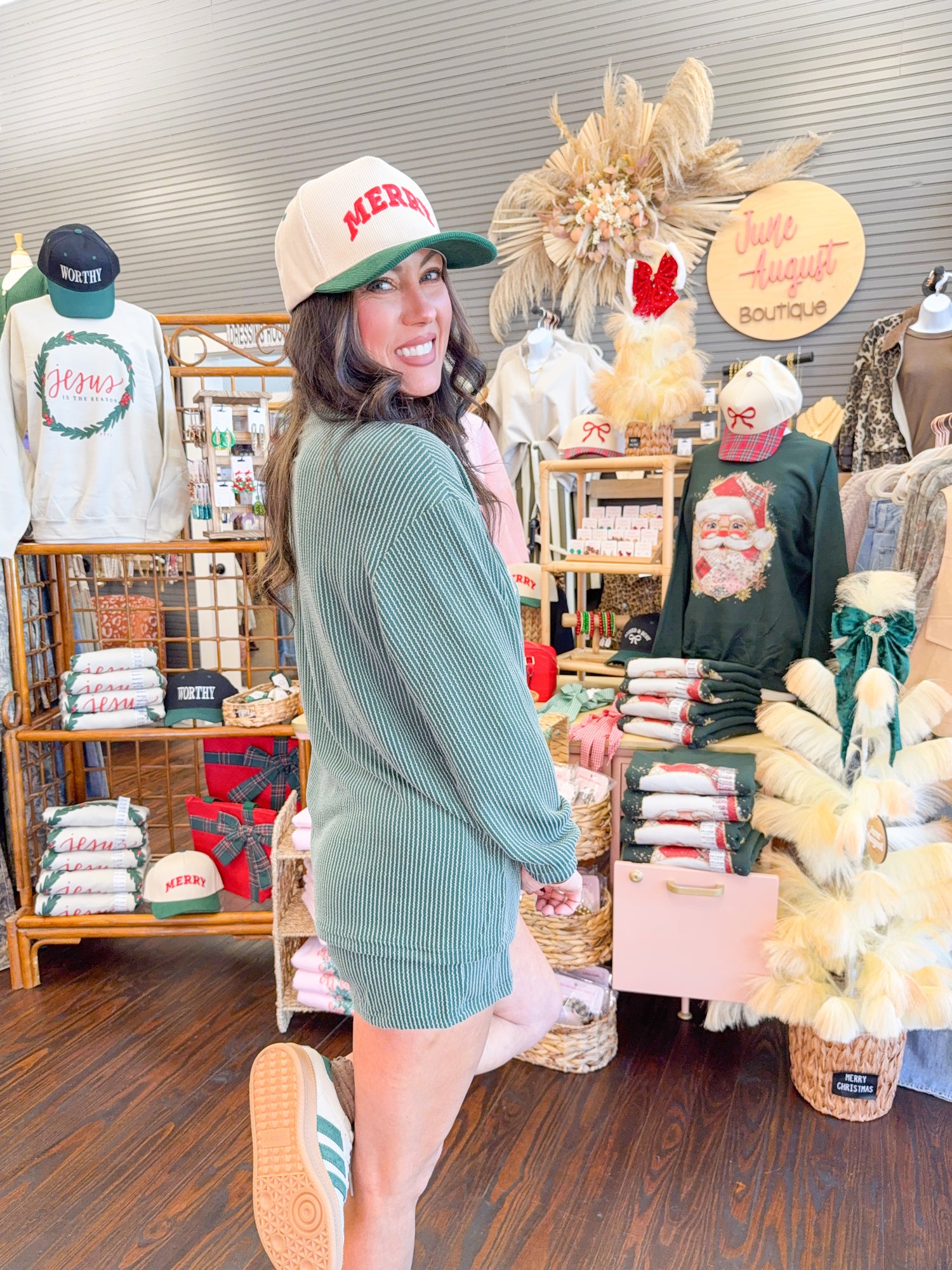 Enjoy cozy style with the Merry Ribbed Shorts Set in rich hunter green. This charming two-piece features a festive "Merry" in red appliqué on the long-sleeve top, perfectly paired with soft ribbed shorts. Ideal for lounging or holiday fun, its comfortable fit keeps you warm without sacrificing mobility. Add a cheerful touch to your wardrobe this season with this stylish and versatile set.