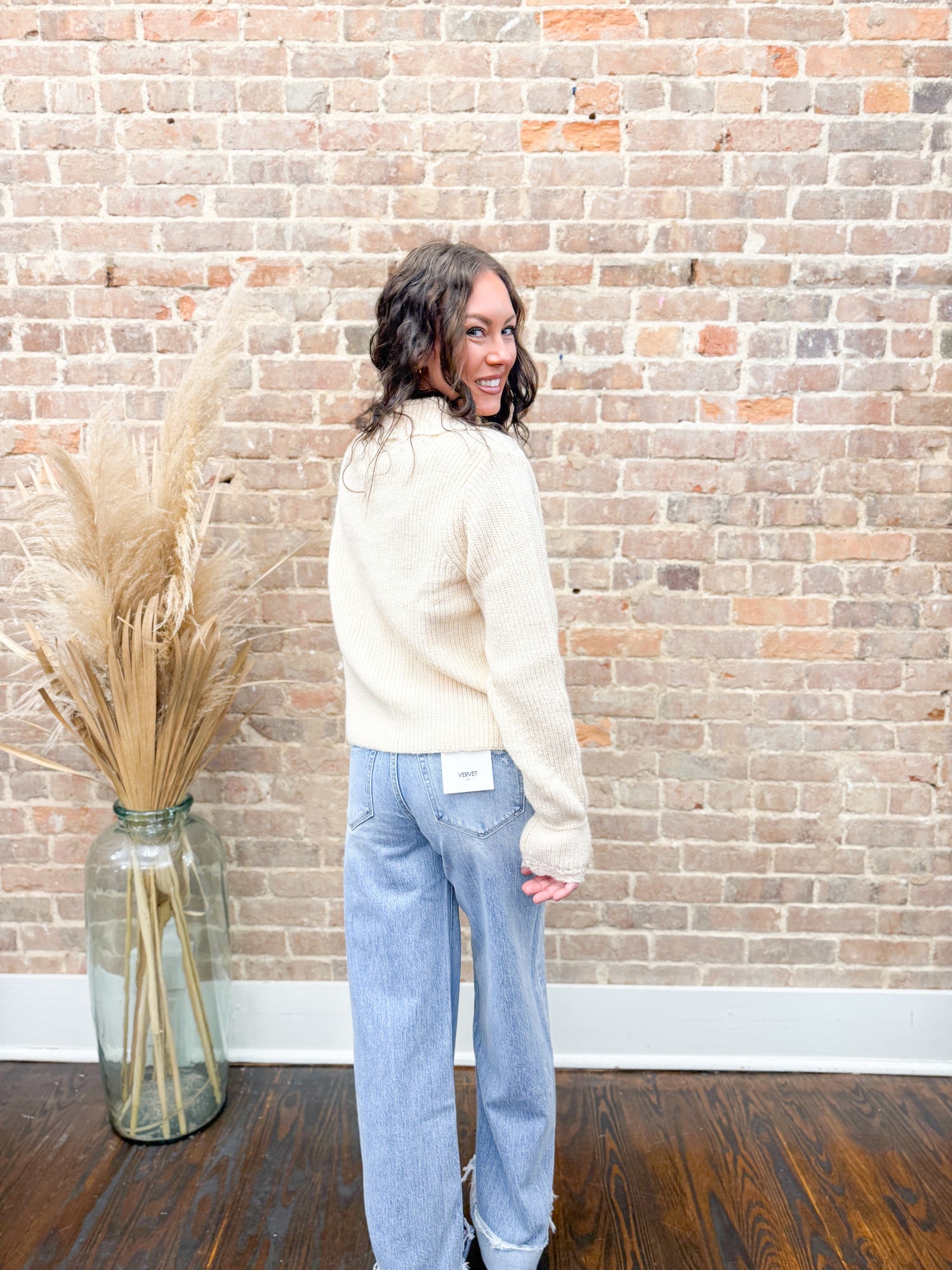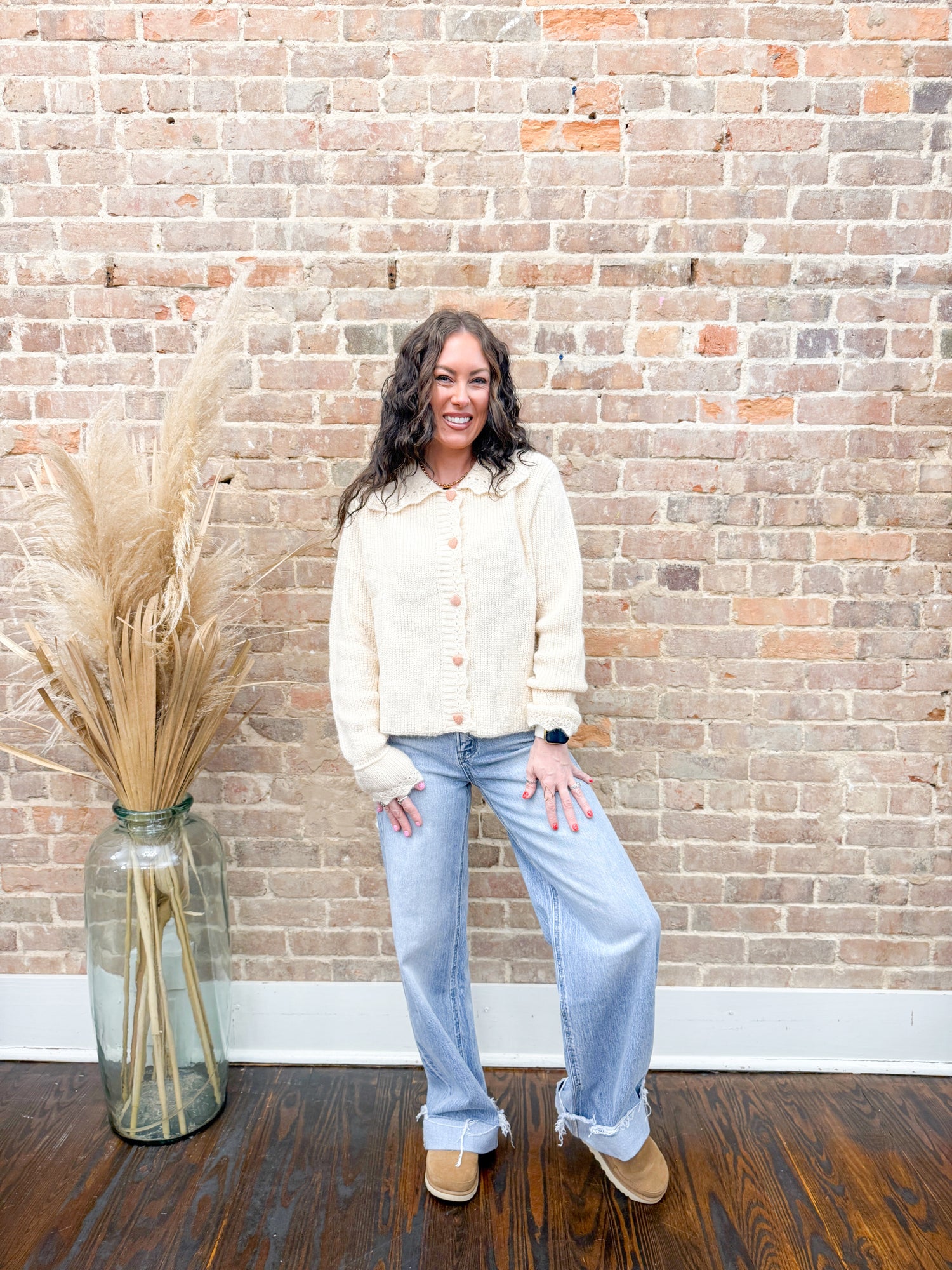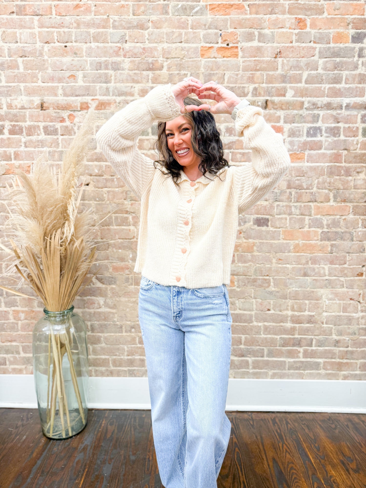 Wrap yourself in sweetness with this charming cream cardigan featuring adorable heart-shaped buttons that add instant personality to any outfit. The delicate scallop edge trim along the neckline and cuffs brings a playful, feminine touch that's perfect for layering over your favorite tees or dresses. Cozy, cute, and endlessly versatile—this Nova cardigan is your new go-to piece for effortless style with a smile.