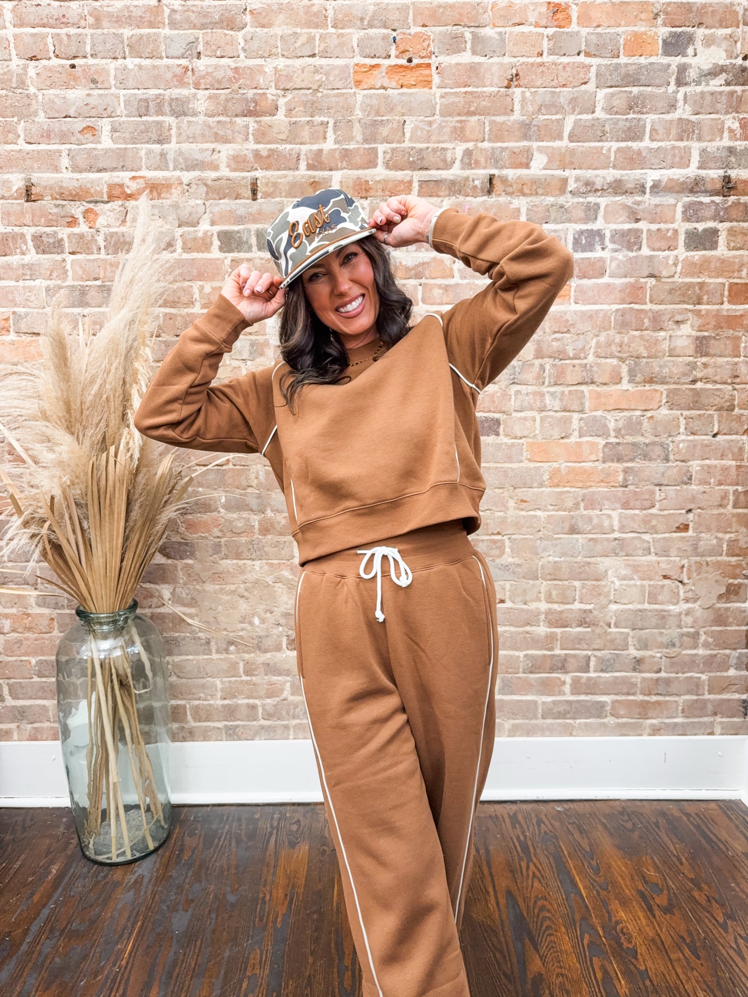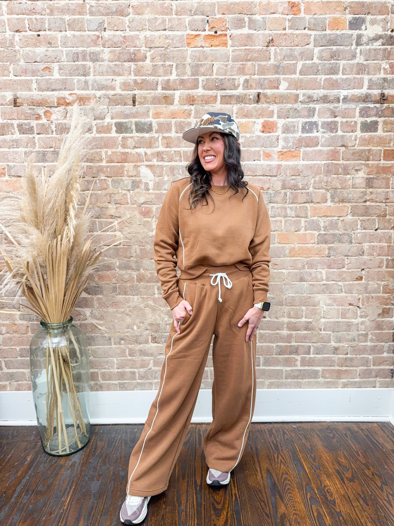 Experience cozy comfort with the Piper Fleece Set, crafted from a soft fleece cotton blend for warmth and breathability. Featuring elegant piped details in a sophisticated brown and ivory palette, this set offers both style and relaxation. Perfect for lounging or casual outings, it keeps you comfortably chic throughout the day.