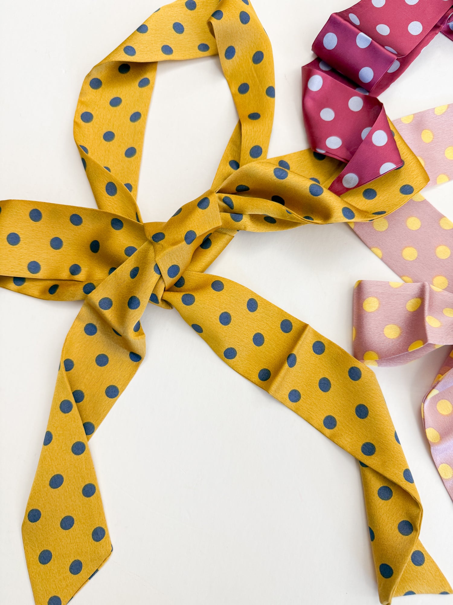 Add a pop of personality to your everyday look with these charming polka dot twillies! Perfect for styling your handbag, wrapping around your neck, or tying up your hair, these versatile scarves bring instant flair to any outfit. The playful polka dot pattern adds a touch of whimsy and retro charm that works with virtually any wardrobe. Lightweight and easy to tie, they're the ultimate accessory for anyone who loves mixing and matching styles. Make a statement—your way!