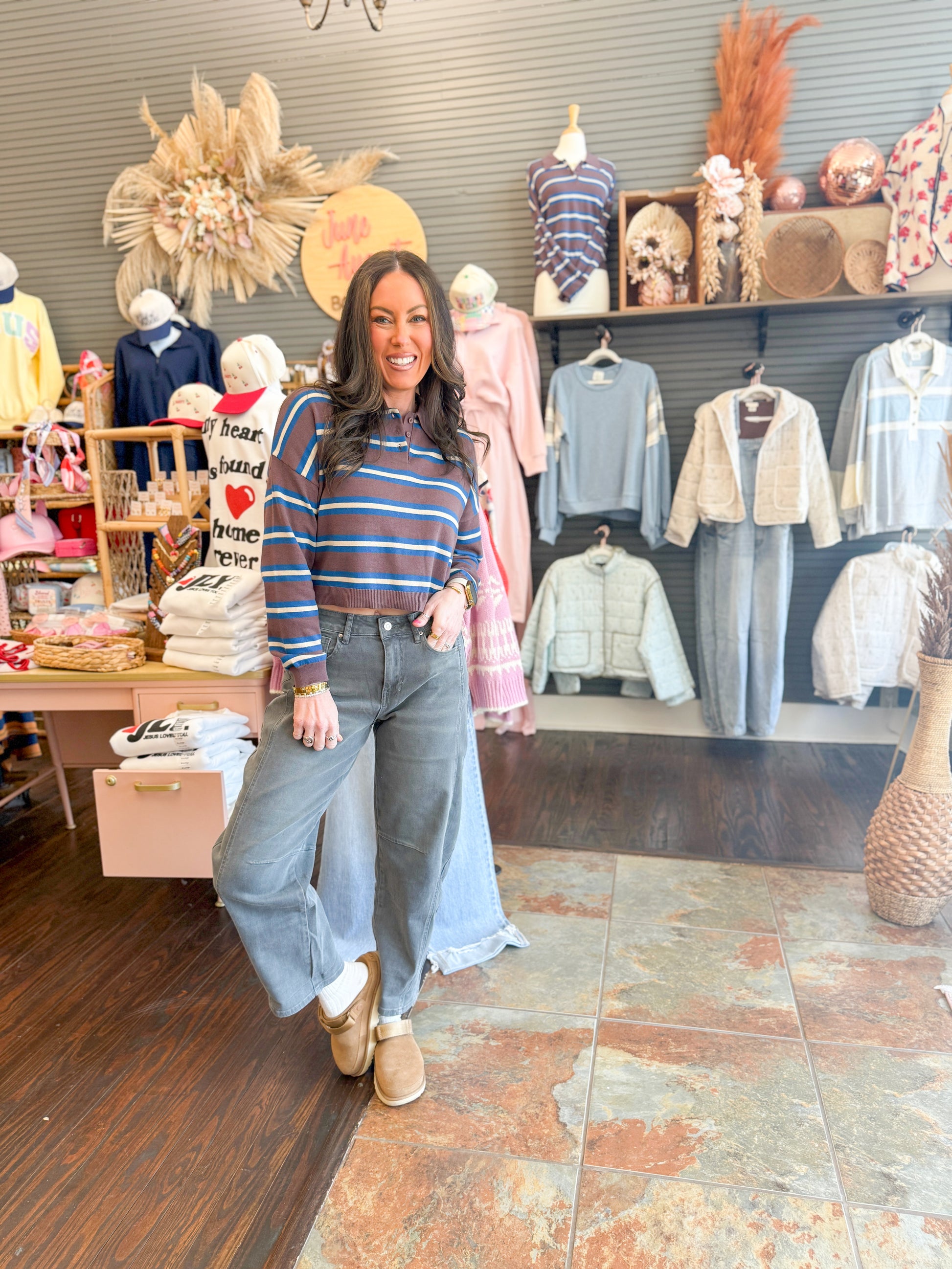 Make a statement with the Presley Stripe Sweater Top, where bold stripe patterns meet unexpected color combinations that refuse to blend in. This collared essential layers effortlessly over your favorite basics, transforming any outfit with its playful, eye-catching design. Perfect for those who embrace individuality and aren't afraid to stand out, the Presley brings personality to your everyday wardrobe. Versatile enough for casual days yet distinctive enough to turn heads, this sweater top is your ticket to looking put-together while staying authentically you.