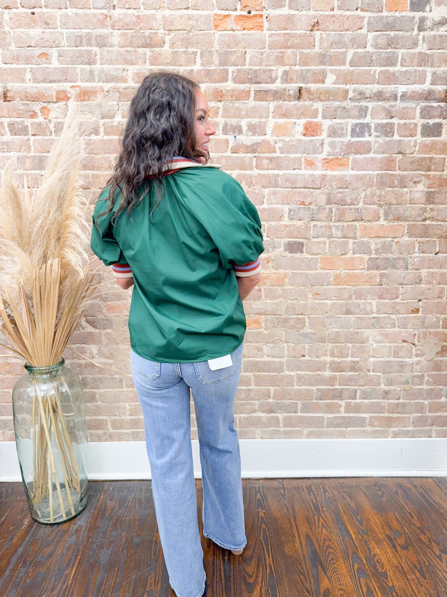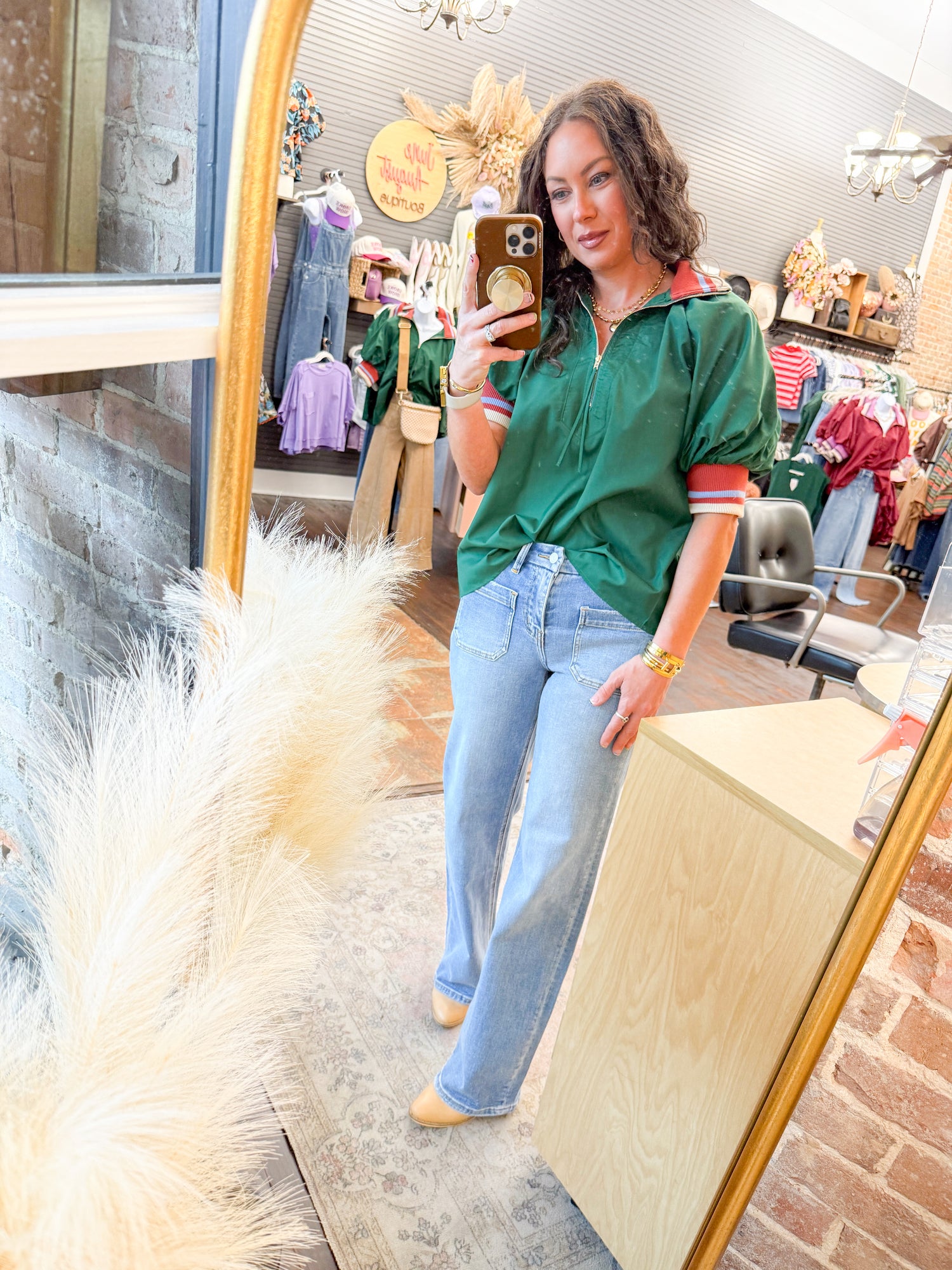 The Raegan Collarded Top combines chic design with functional details. Its contrast striped collar adds a bold touch of style, while the gold zipper enhances both aesthetics and ease of wear. Perfect for elevating your everyday look with subtle sophistication.