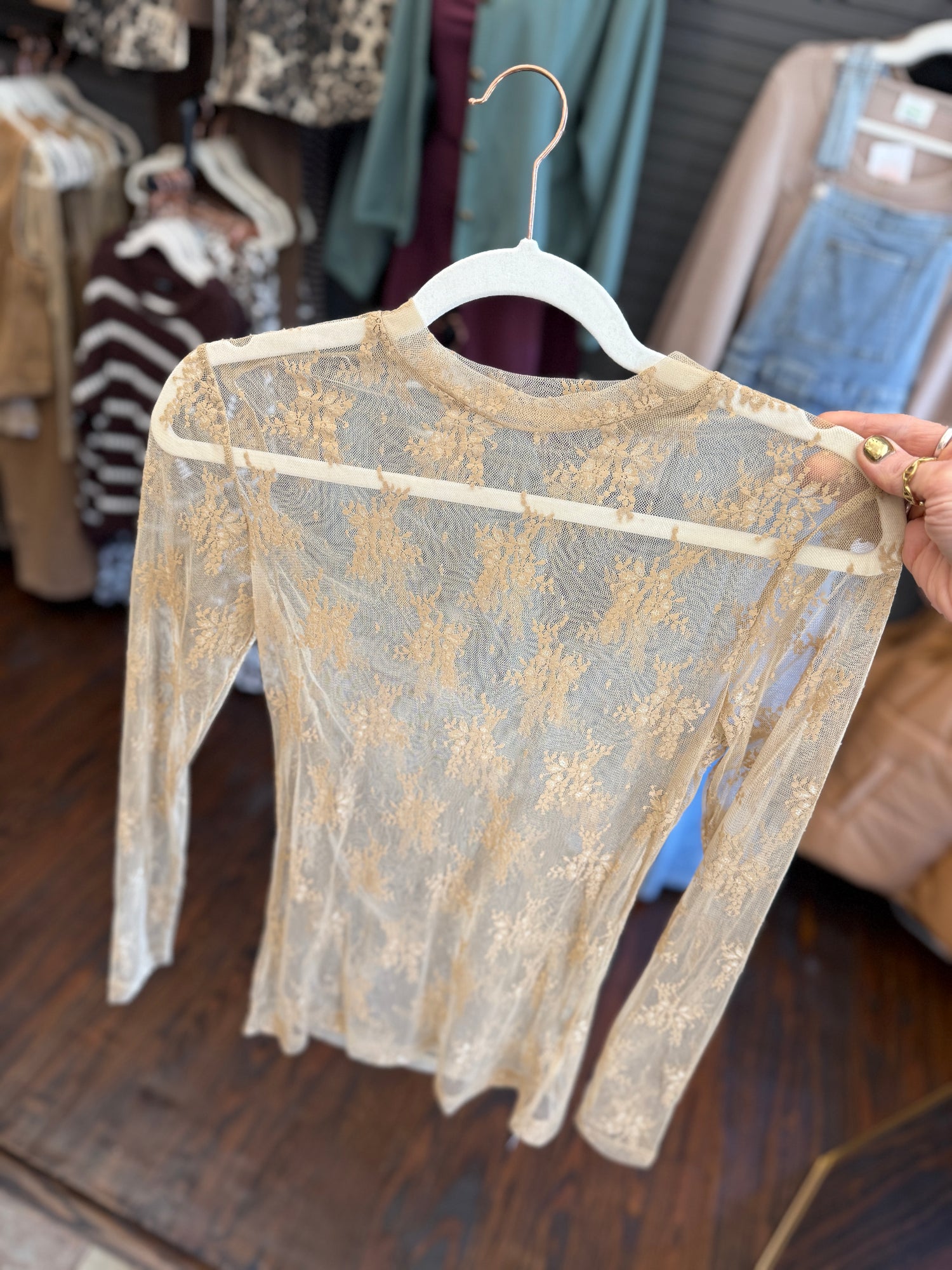 The Rikki Lace Mesh Top in taupe offers a chic mock neck design that adds a touch of elegance to any outfit. Crafted to fit true to size, it ensures a comfortable and flattering silhouette. Perfect for layering or wearing on its own, this top combines delicate lace detail with modern style for a versatile wardrobe staple.