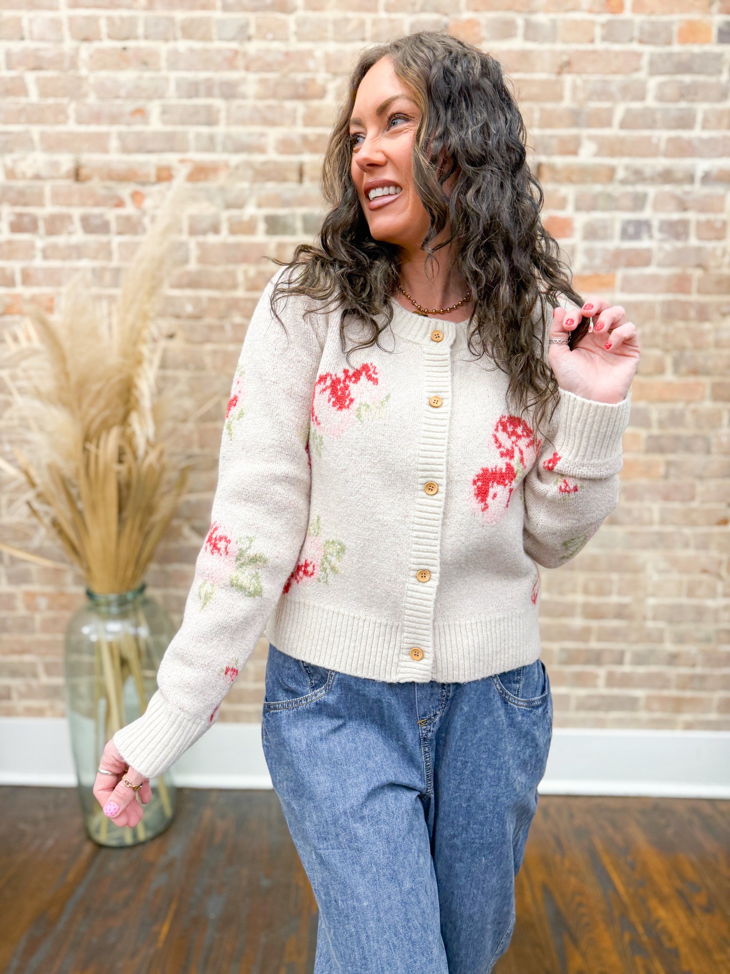 Sofie Floral Cardigan Throw on this charming cardigan and instantly elevate your everyday look! Featuring a playful floral pattern, this piece brings personality to any outfit. The classic button-down front makes layering effortless, while the round neckline keeps things chic and versatile. A ribbed hem keeps everything in place, giving you that polished finish without the fuss. Perfect for those days when you want cozy meets cute!
