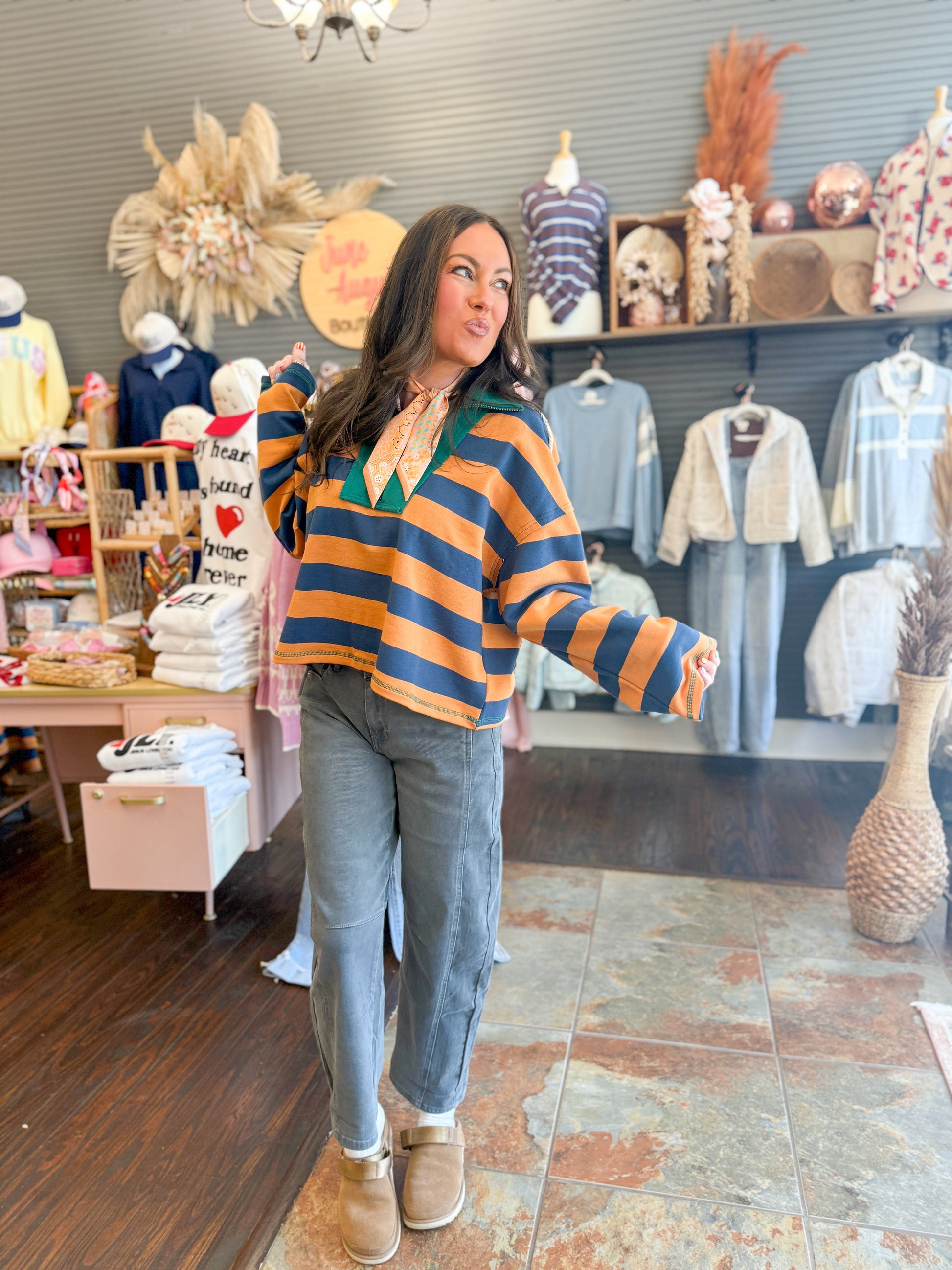Elevate your everyday style with the Tessa Colorblock Stripe Top, where bold color combinations meet timeless design. This half-zip collared piece features chunky stripes in unexpected hue pairings that instantly refresh any wardrobe. Perfect for layering or wearing solo, the structured collar and relaxed fit offer versatility for casual outings or weekend adventures. Make a statement without trying too hard—this top transforms basic basics into conversation-starting looks that showcase your confident, fashion-forward taste.