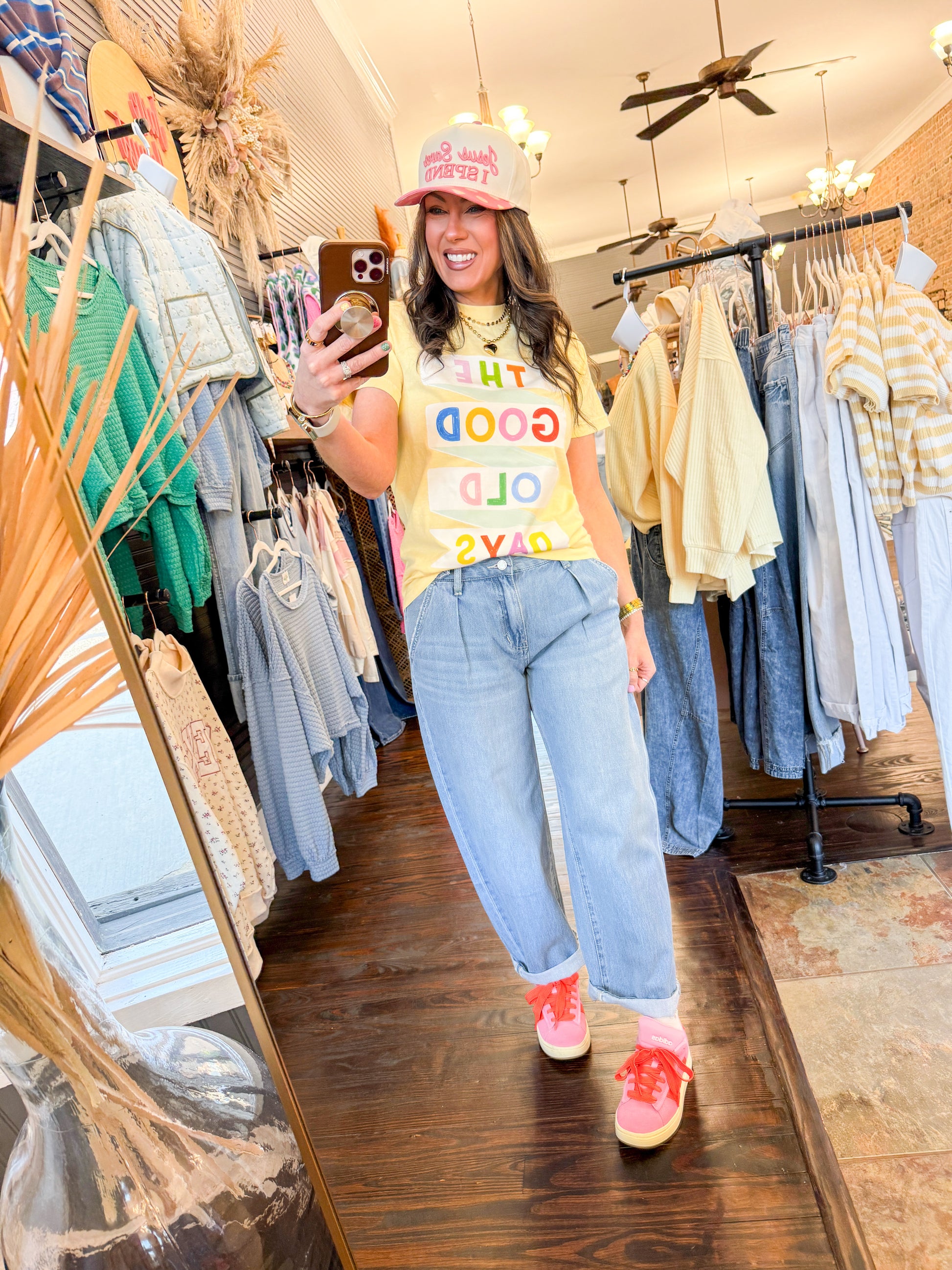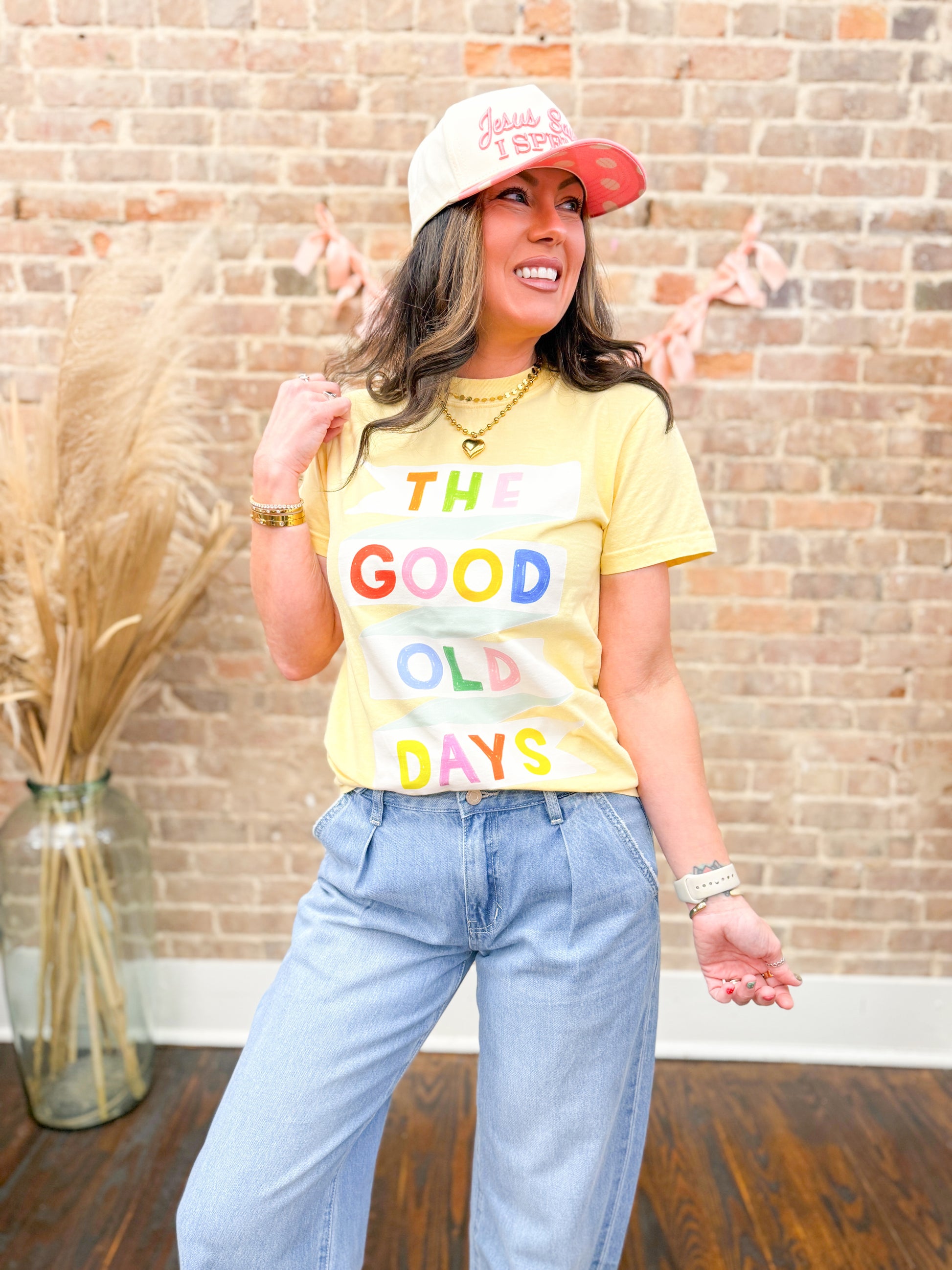 Step back in time with The Good Old Days T-Shirt, where nostalgia meets comfort. This playful tee features vibrant, colorful graphic letters that pop against a warm butter yellow base—the perfect shade for feeling cozy and cheerful. Soft and wearable, it's ideal for anyone who loves retro vibes and wants to make a lighthearted statement. Whether you're channeling vintage style or just craving that feel-good factor, this tee delivers comfort with a smile.