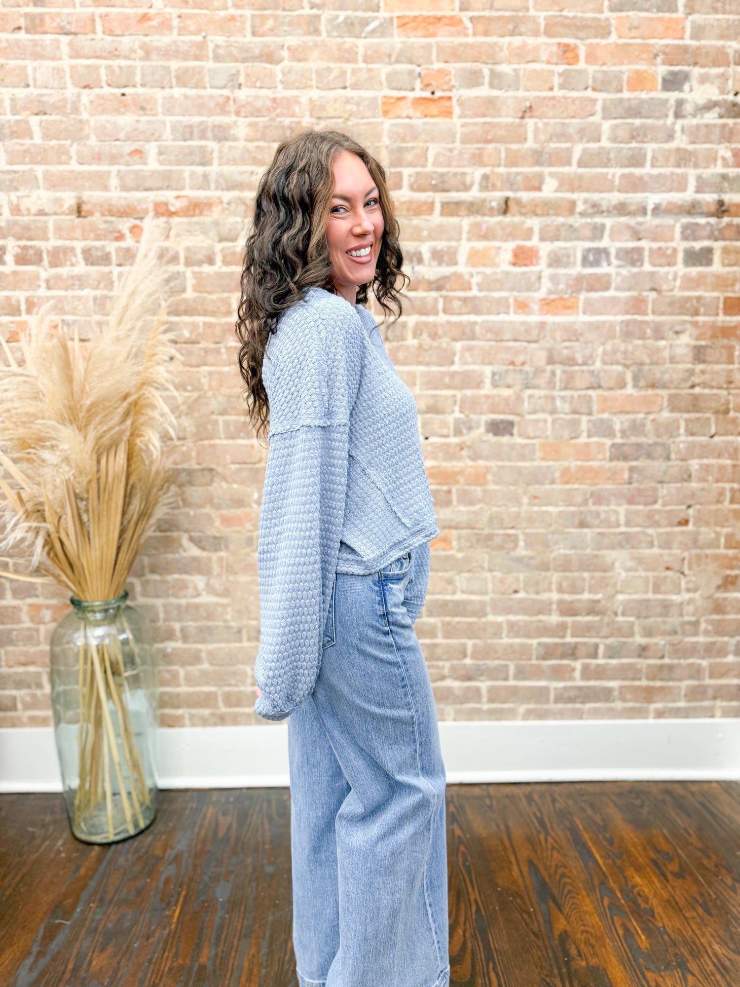 Effortlessly chic and oh-so-cozy, the Willow Waffle Top is your new go-to for laid-back style. This oversized solid-color beauty features a textured waffle knit that adds visual interest while keeping things wonderfully soft. The round neckline and dreamy balloon sleeves give it a playful, relaxed vibe that works just as well with jeans as it does with your favorite loungewear. Perfect for those days when comfort and style need to be best friends.